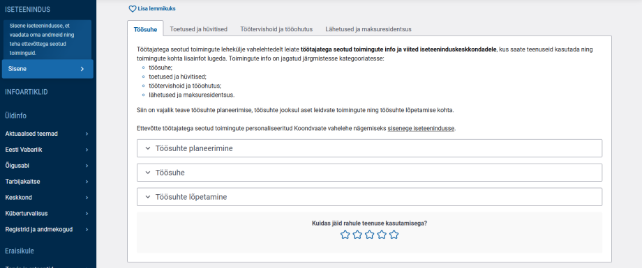 Ettevõtte töötajatega seotud toimingute teenus kuvatakse ettevõtjale pärast iseteenindusse sisse logimist vasakmenüüs. Toiminguid on jaotatud selgetesse äriloogilistesse kategooriatesse nagu: töösuhe, toetused ja hüvitised, töötervishoid ja tööohutus, lähetused ning maksuresidentsus.